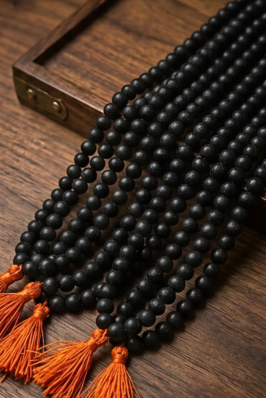 नैसर्गिक ब्लॅक एबनी लाकडापासून बनलेली करुंगाली माळा जी सकारात्मक ऊर्जा आणि मानसिक शांती देण्यासाठी ओळखली जाते