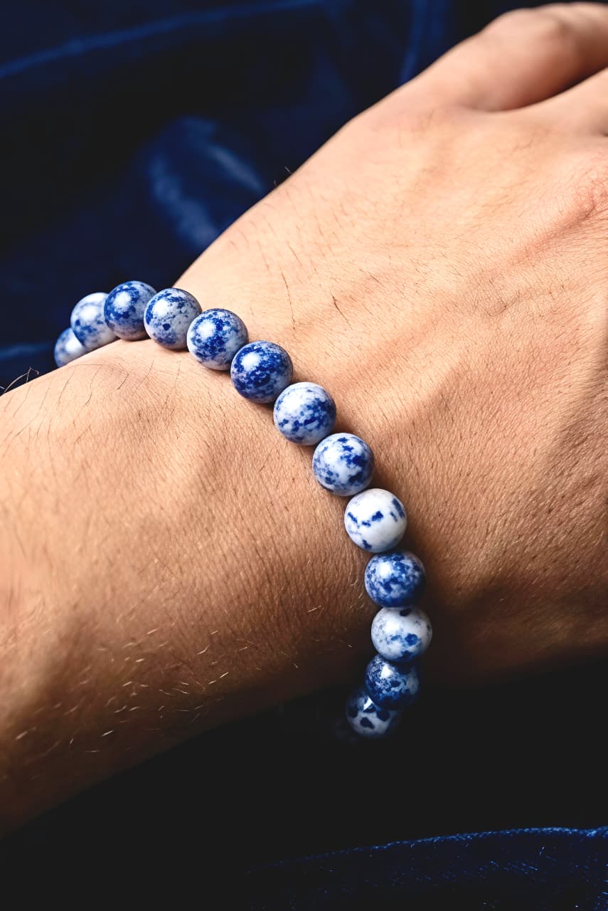 हे ब्रेसलेट नैसर्गिक सोडालाईट दगडांपासून तयार केलेले असून त्यामध्ये निळ्या रंगासोबत पांढऱ्या कॅल्साईटच्या सुंदर रेषा दिसतात. हे थ्रोट चक्र आणि थर्ड आय चक्र सक्रिय करण्यास मदत करते.